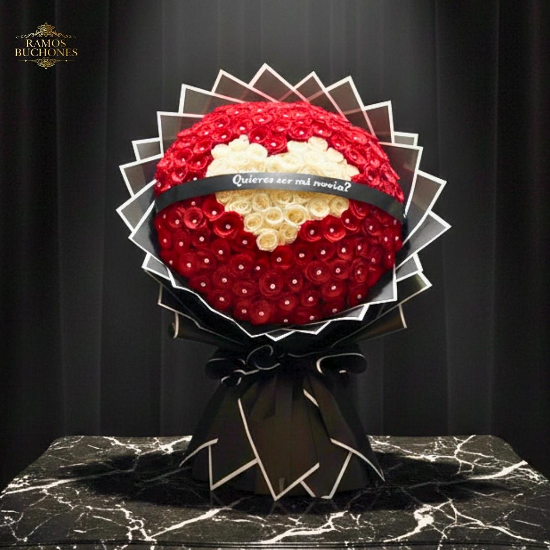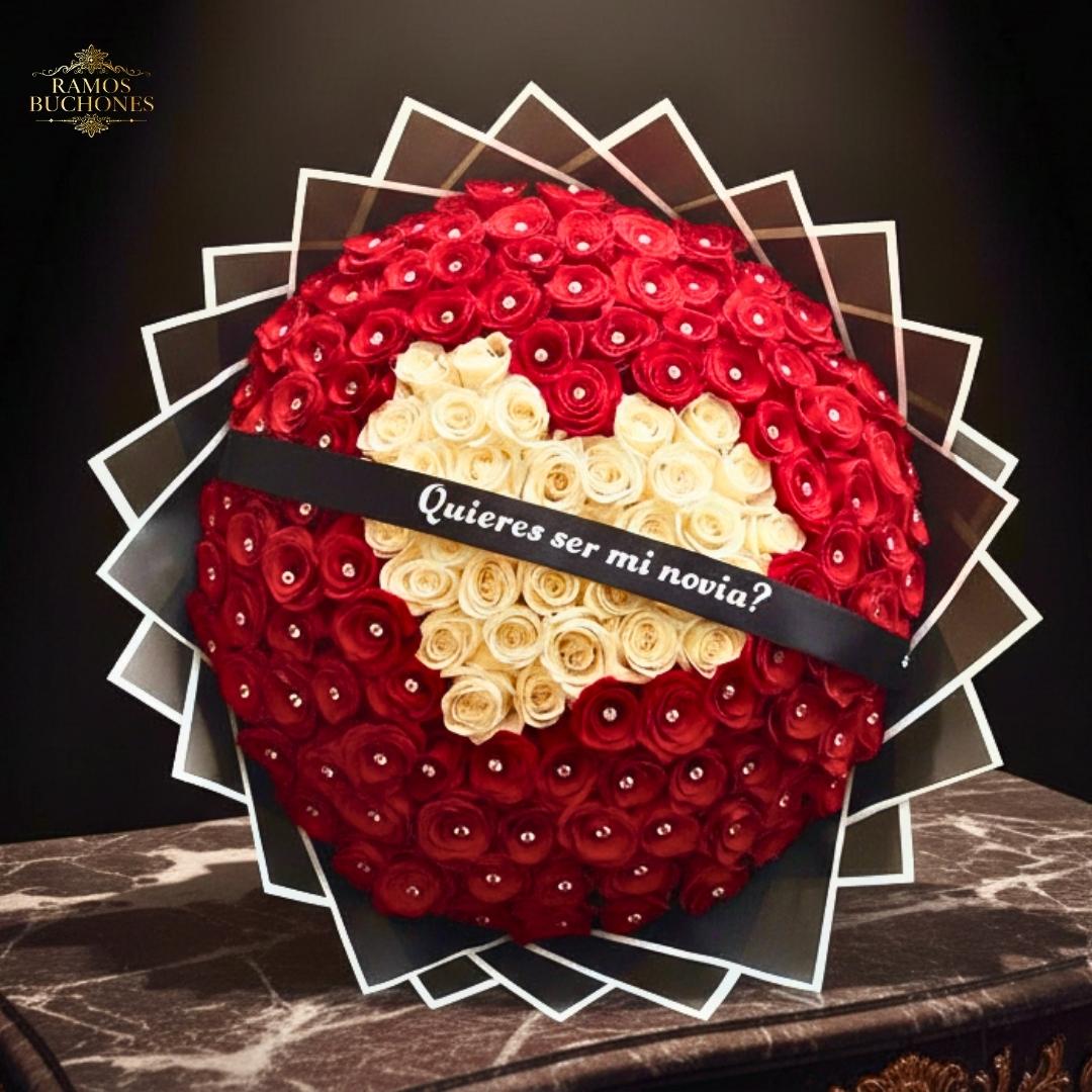 Compuesto por 150 rosas en tonos rojo rubí y marfil, forma un corazón central rodeado de pétalos intensos adornados con cristales brillantes.