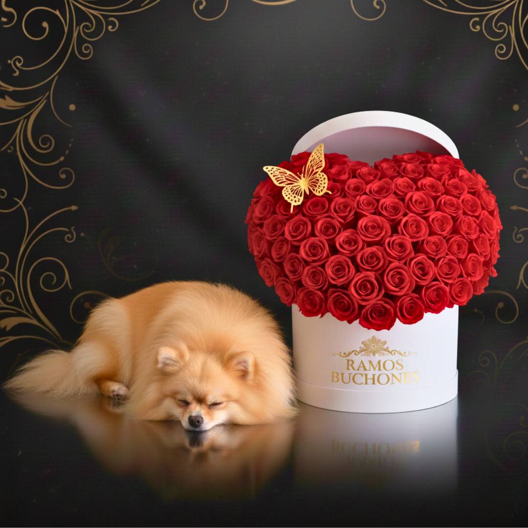 Con 180 rosas rojas de tallo corto, este arreglo destaca por su forma de corazón impecablemente delineada, adornada con una mariposa dorada que evoca elegancia y transformación. Ideal para transmitir cariño sincero con un aire de sofisticación —un detalle digno de los corazones más nobles.
