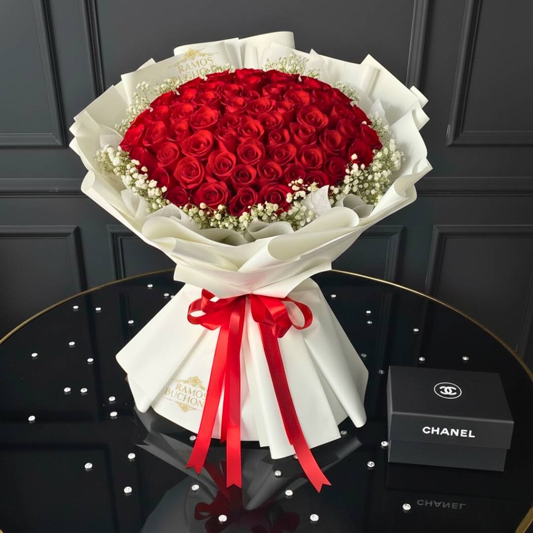 Ramo de 100 rosas rojas envuelto en elegante papel blanco y listón carmesí