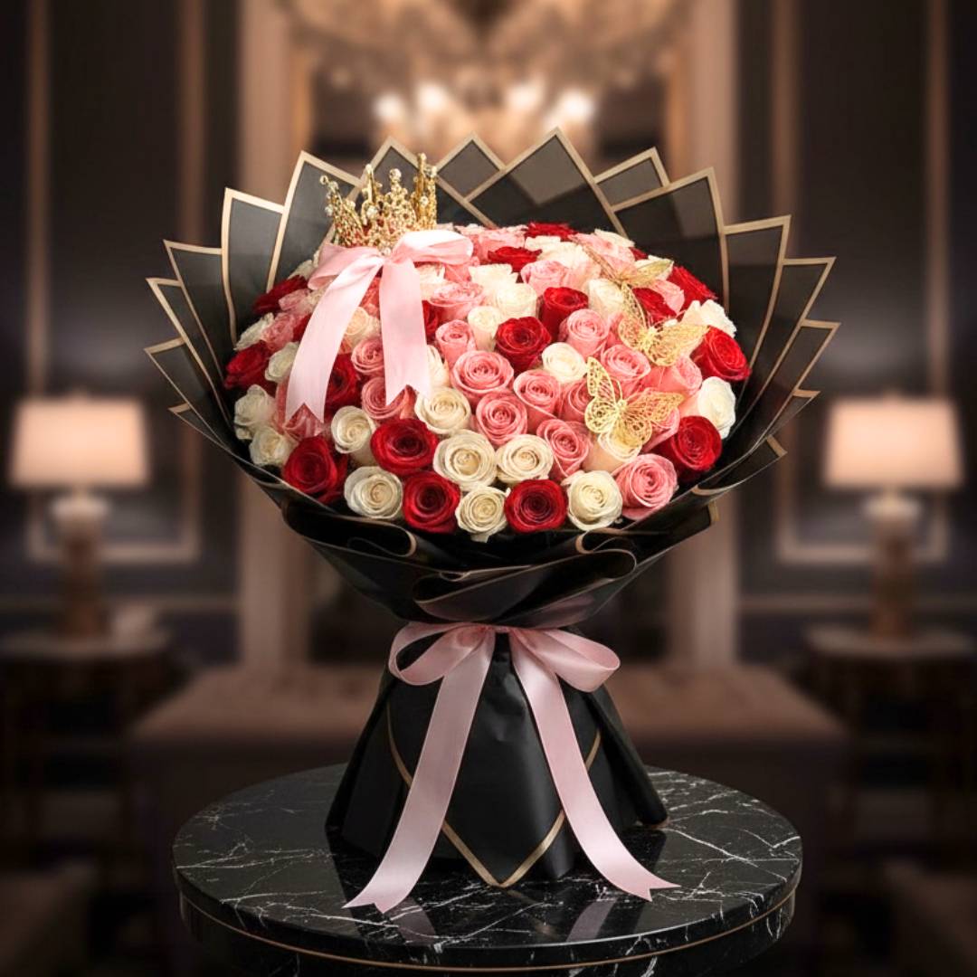 Es la máxima expresión del romance y la realeza floral. Con 150 rosas finamente seleccionadas, este bouquet fusiona la pasión del rojo, la ternura del rosa y la pureza del blanco, envueltas en un elegante papel negro con bordes dorados que realzan su sofisticación.