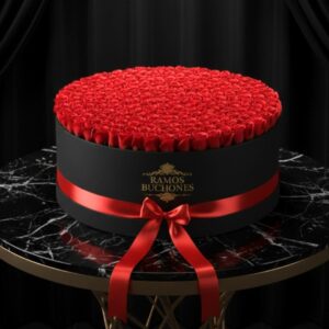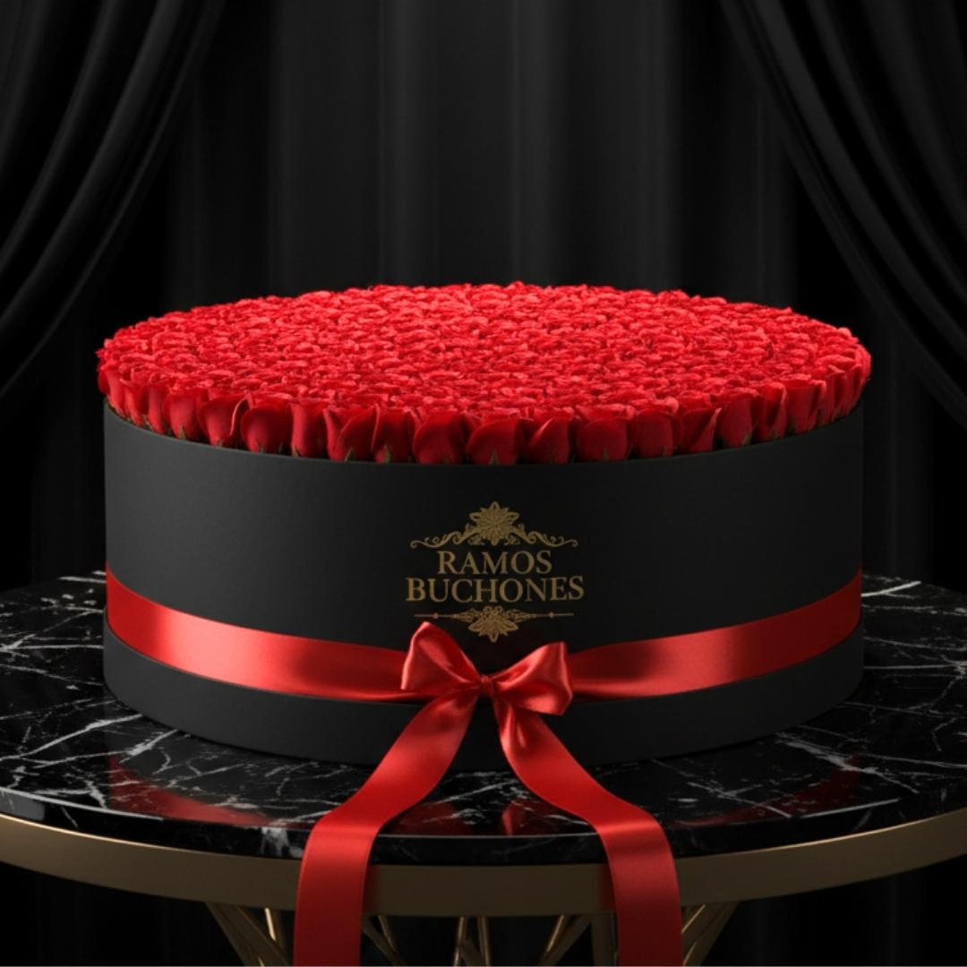 Con 300 rosas rojas perfectamente alineadas dentro de una elegante caja negra adornada con un lazo de satén escarlata, este diseño exuda sofisticación, pasión y poder.