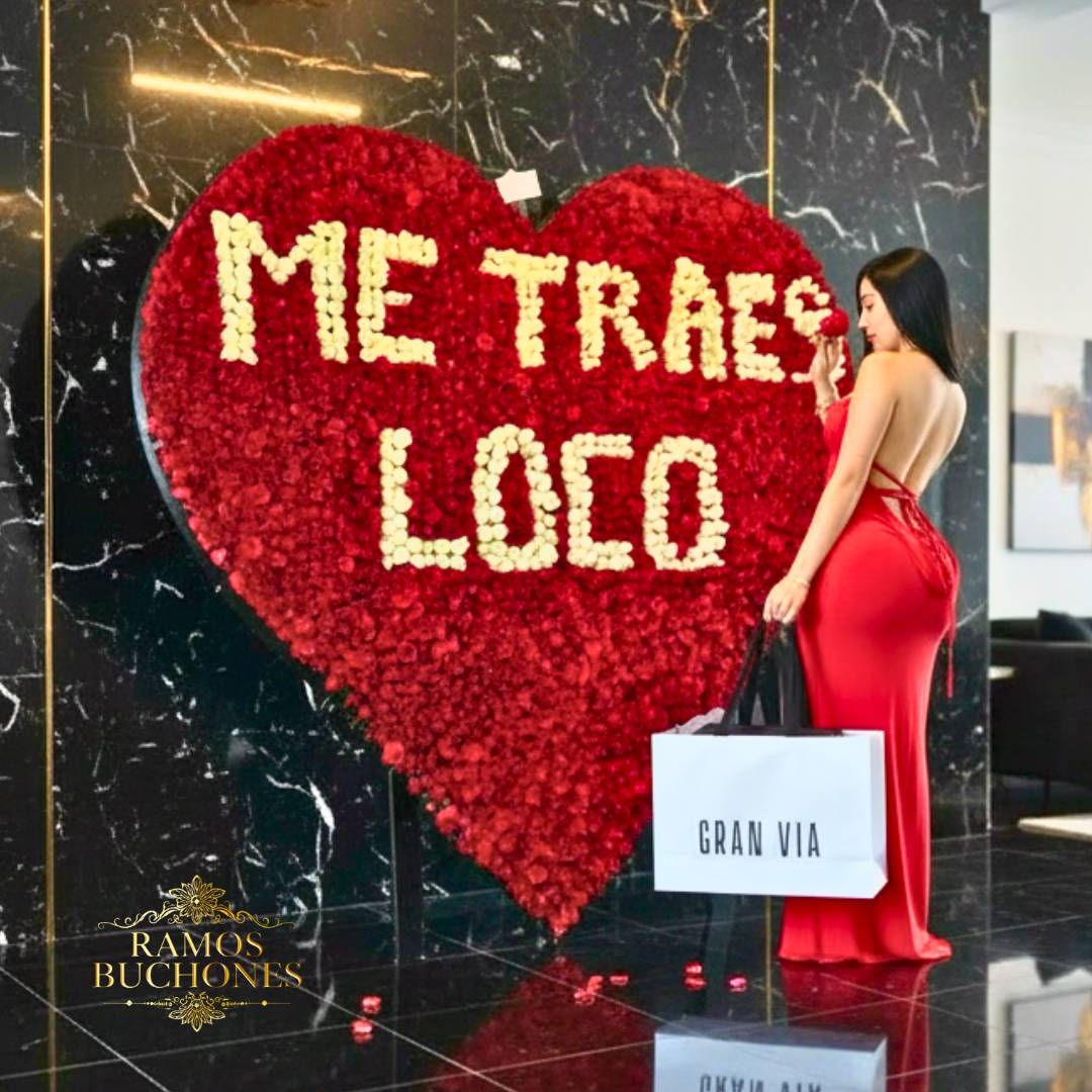 Un majestuoso corazón de 1,000 rosas rojas con la frase “ME TRAES LOCO” (Tu eliges). Formada con rosas crema, símbolo de amor intenso y pasión sin límites.